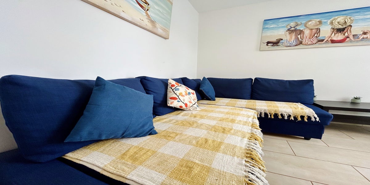 The lounge area is fitted with an L-shaped sofa bed and ceiling fan, with patio doors opening onto a private terrace furnished with a table and chairs for outdoor dining. Two fold-up sun loungers are also provided for guests’ use and must be returned to the apartment if taken to the pool area.