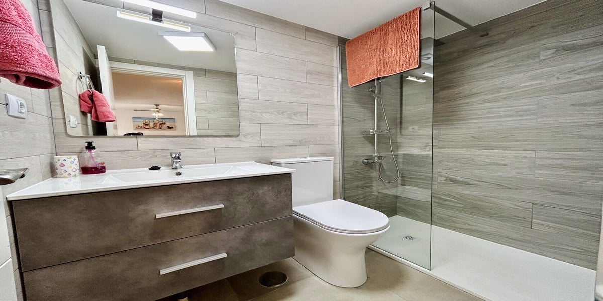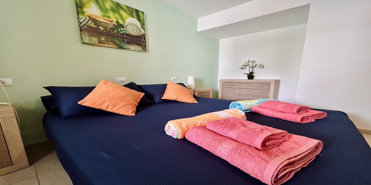 The apartment features a comfortable double bedroom with a large wardrobe and ceiling fan, a modern walk-in shower room, and a well-equipped kitchen including an oven, four-ring hob, washing machine, fridge/freezer, toaster, and kettle.