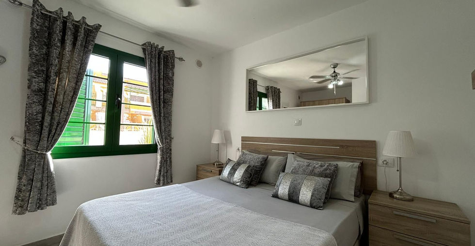 Situated on the front row of the complex a one bedroom, ground floor bungalow in central Caleta de Fuste. The bungalow consists of a double bedroom with wardrobe, walk in shower room, kitchen with oven, hob, washing machine, fridge/freezer, toaster, coffee machine and kettle. The lounge is equipped with a sofa and TV and patio doors that lead out onto a sunny terrace with outside patio furniture and two sun beds.